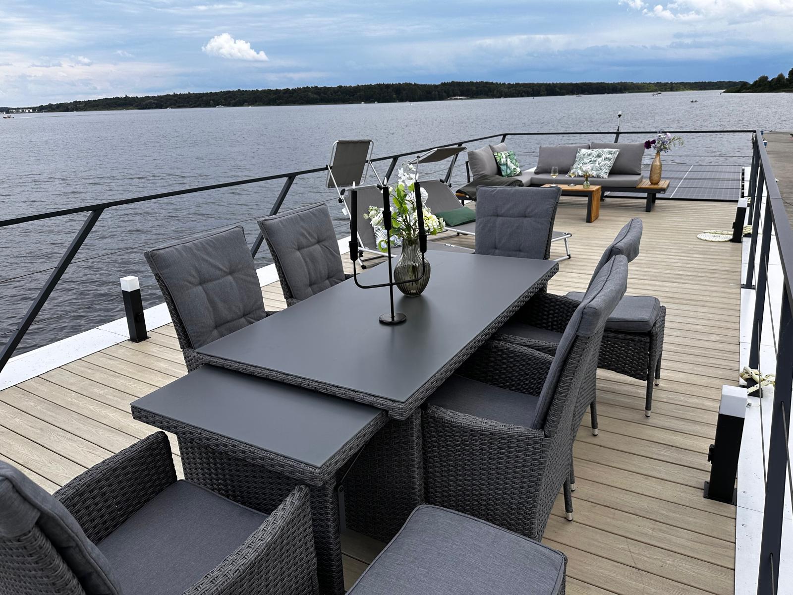 Moderne Bootsterrasse mit Seeblick – Stilvolle Outdoor-Oase auf dem Hausboot