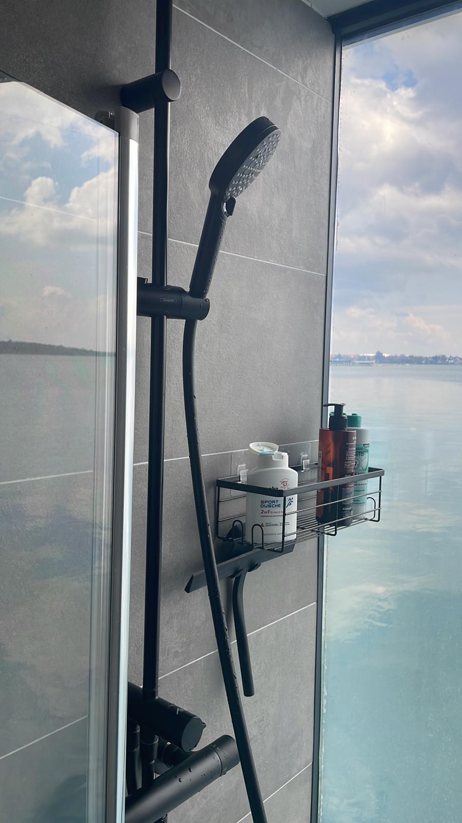 Luxuriöse Regendusche mit schwarzer Armatur & Ausblick – modernes Bad Design für deinen Hausbooturlaub
