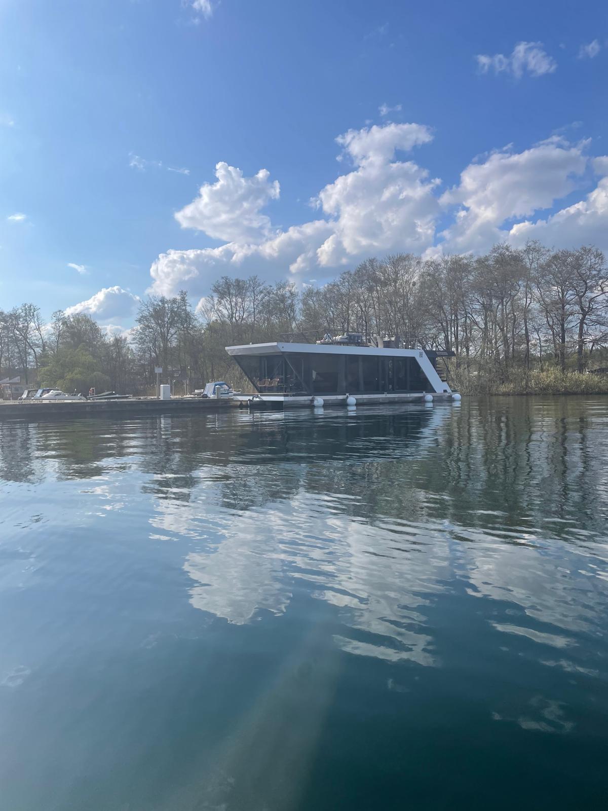 Modernes Hausboot auf idyllischem See – Wohnen & Natur vereint in stilvollem Design