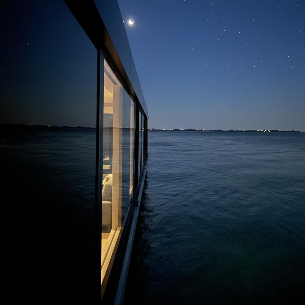 Nächtliche Wasserlandschaft mit Mondlicht & Architektur – Stimmungsvolles Nachtbild