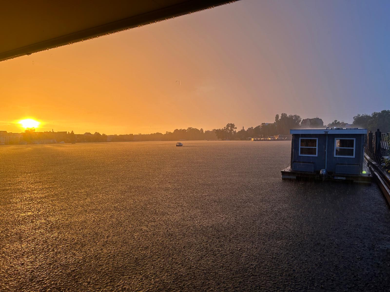 Nach einem kurzen Regenschauer ist die Luft klar und frisch – die perfekte Atmosphäre für einen spektakulären Sonnenuntergang. Die untergehende Sonne spiegelt sich intensiv im Wasser und taucht den Himmel in leuchtendes Rot, Orange und Violett.